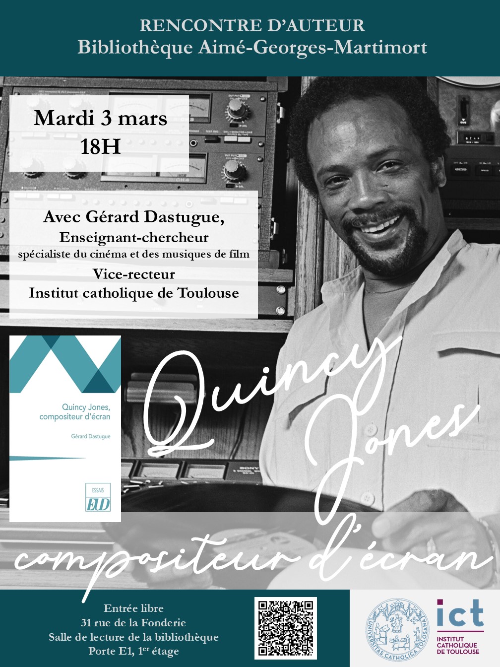 Le mardi 3 mars à 18h, Gérard Dastugue, enseignant-chercheur en cinéma & musique de films et vice-recteur à la vie étudiante à l’ICT, viendra présenter son ouvrage Quincy Jones, compositeur d’écran.